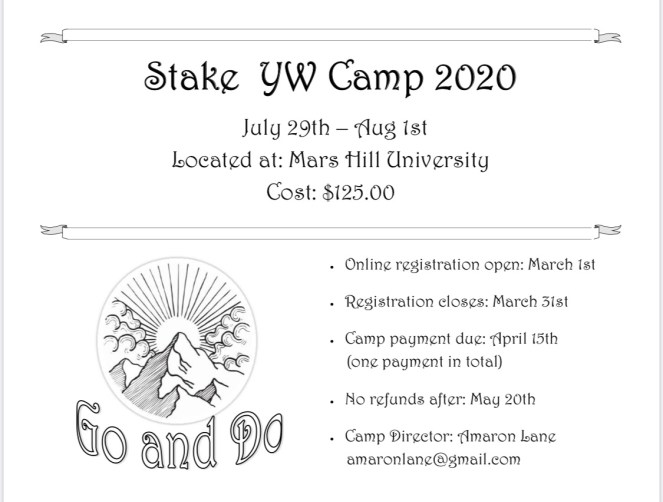June 18-20- Youth conference with Kingsport, TN and West Columbia, SC Stakes (no cost) at Mars Hill