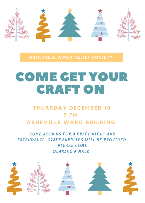 We are excited to announce our RS holiday activity for Thursday Dec 10 @ 7pm where we can safely socially distance at the church. We will be making small nativities with all craft supplies provided. Temperatures will be taken at the door and we ask that if you are experiencing any symptoms of coughing, sneezing, runny nose, fever, or general sickness that you join us for a future activity instead. Please remember to bring your mask.